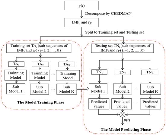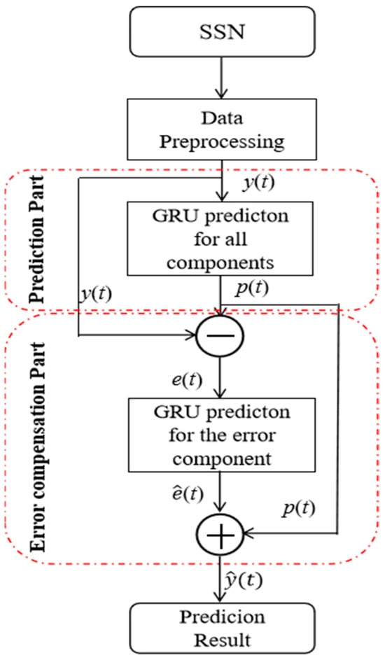 The flowchart of our algorithm, which is based on CEEMDAN-GRU and error compensation for predicting sunspot numbers in this study, is shown in Figure 2. The detailed process of the prediction part is shown in Figure 3. Our algorithm first utilizes the CEEMDAN to decompose the SSN into several sub-sequences, including some IMFs and a residual. To improve the prediction accuracy, each sub-sequence—supposing the index is i (I = 1, …, K)—is reconstructed into a training set (TAi) and a test set (TNi). The corresponding prediction sub-model (called sub-model i) based on the GRU network is trained by TAi for its optimal parameters. Then, sub-model i is validated by predicting its TNi. To reduce the error between the prediction result and SSN, the error compensation method based on the GRU network is used. We use SSN and the e(t) as inputs and outputs to train the GRU network; then, the error e(t) is taken as the input of the trained GRU network to predict a new error . The final prediction result is generated by adding the prediction result and the .