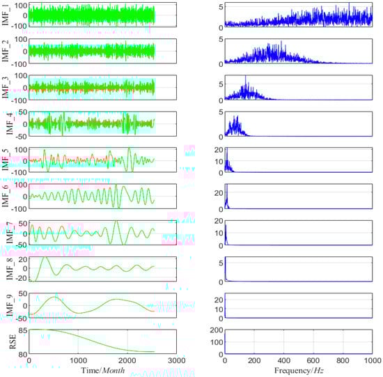 Empirical mode decomposition (EMD) is an adaptive time–frequency decomposition method, which can decompose a linear signal or non-linear signal into a finite intrinsic model function (IMF), and each IMF presents a different time-scale feature. Aiming at the mode mix problem in EMD, CEEMDAN can solve it by adaptively adding white noise [49].