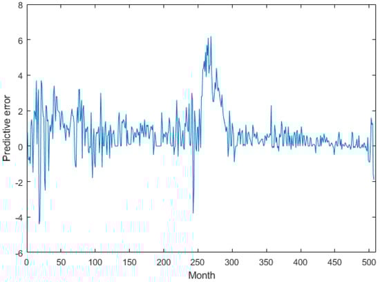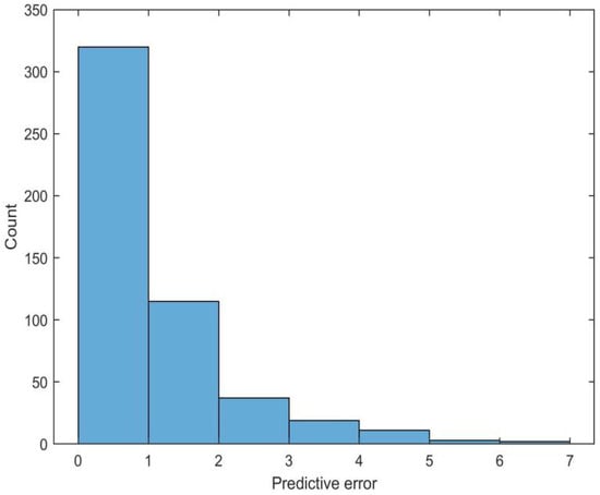 To analyze the error between the predicted result and the original data, the predictive error sequences can be calculated using , and they are denoted as PE. The error result PE is shown in Figure 6. In the figure, we can observe that many predictive errors are very close to 0. Figure 7 shows the histogram of PE, the amount of PE with ranges at [0, 1], [1, 2], [2, 3], [3, 4], and their counts: 320, 115, 37, 19, and 16. Therefore, this shows that most errors are clustered around 1.