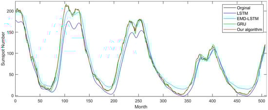 The classical time series prediction algorithms, including LSTM, GRU, and the composite algorithm EMD-LSTM, are compared with our algorithm. Figure 8 presents the predictive results of these algorithms. The lines in black, blue, cyan, green, and red correspond with the original data and the predictive results of LSTM, EMD-LSTM, GRU, and our algorithm. We can observe that all algorithms can reflect the entire trend and simulate the change in SSN. However, the results of two algorithms, including LSTM (blue line) and EMD-LSTM (cyan line), present relatively large differences compared to the original data. The result of the GRU is close to the original data, but the abrupt change points and the fluctuation parts exhibit obvious differences with the corresponding original data. Our algorithm can effectively overcome these problems, and the red line (our predictive result) is close to the black line (original data).