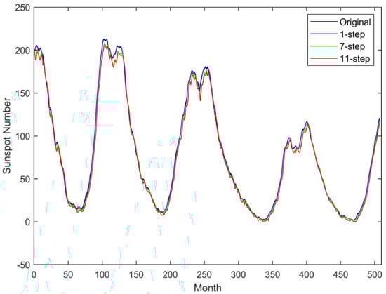 To evaluate the generalization ability of our algorithm, we attempt to perform predictions for an additional 7 and 11 months. The prediction comparisons of the original SSN (black line), the next 1 month (blue line), the next 7 months (green line), and the next 11 months (red line) are shown in Figure 9. As the prediction step increases, the predicted results move further away from the true value. We can also note that these lines manifest differences for some values, especially fluctuating values. Table 5 presents the values of the indicators. The longer the prediction step, the more clearly the indicator increases. The table shows that the 1-day predictive accuracy is advantageous than others.