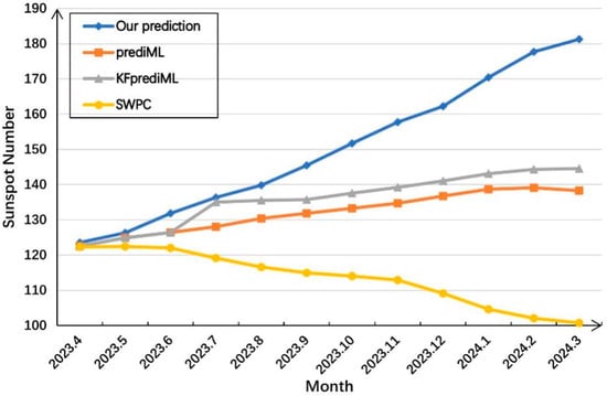 Because a substantial number of researchers also use different methods to predict future sunspot numbers, we download the predictive results of the well-known prediML, which is proposed by McNish and Lincoln [55,56], and the improved method using the Kalman filter (KFprediML) [9] from SIDC (Source: WDC-SILSO, Royal Observatory of Belgium, Brussels, Belgium). The predictive result is also downloaded from SWPC (Website: https://www.swpc.noaa.gov/ accessed on 21 July 2023) and denoted as SWPC. The predictive future results of different algorithms from April 2023 to March 2024 are shown in Figure 10. Our predictive results show that the sunspot number will continue to increase in the future, and its trend is similar to prediML and KFprediML. However, the result of SWPC exhibits an inverse trend. Due to the possible noise in the source data, the error between the observations and the real sunspots, and the generalizability of the model, our results can only reflect the development trend of sunspots. The change in sunspots may affect the actual operation of electronic systems and equipment. By predicting the change trend, the operation state of relevant electronic equipment can be adjusted in time.