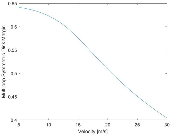 This choice of tuning is further motivated by an analysis of the disk margins when the system operates at velocities other than 30 m/s. To perform this analysis, the disk margin is computed (with the skew parameter set to 0) considering input and output disturbances []. The plant used in this analysis is frozen at a velocity ranging between 5 and 30 m/s. The resulting disk margin values, shown in Figure 4, represents the maximum radius of the symmetric disk in the complex plane that contains stable disturbances. The results show that robustness increases as the system’s velocity decreases. Therefore, the closed-loop system becomes more robustly stable at lower velocities, motivating the decision to tune the controller at the highest feasible velocity rather than some other lower velocity. However, the cost of improved robustness is decreased performance at lower velocities.