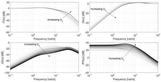 The result of this tuning routine is that at velocities above 20 m/s, the parameters varied very little. To simplify tuning, is held constant for velocities above 20 m/s. However, even though the reference model transfer function does not change when the velocity is above 20 m/s, the computed controller still varies because the plant varies. The resulting bode plots of the gang of four, , , , and , are shown in Figure 5. Here, is the sensitivity transfer function, and is the product of with . Figure 5 shows the frequency response of each transfer function as velocity increases in the range 5–40 m/s, represented as the transition from white to black colored lines.