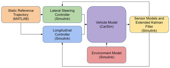 The steering control literature is vast, so a small sample of steering control algorithms is selected, as will be explained in Section 2.1. The controllers are chosen in an attempt to provide information on what will be the most successful future direction of research. To compare these controllers, several maneuvers and environmental conditions are developed in Section 2.5. Together, they constitute samples of existing ODDs that need to be solved to achieve SAE Level 5 driving []. To compare each controller on the same ODDs in a highly repeatable manner, CarSim 2020 is extended with various models as explained in Section 2.3. This simulation realistically captures the most significant phenomena in highway driving. It combines models of the environment and its associated disturbances with a high-fidelity vehicle model that captures tire–road interactions and powertrain dynamics. To compare each controller objectively, several metrics are proposed in Section 2.6. Finally, the results are presented and discussed in Section 3.