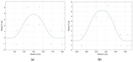 - Vehicle model and performance requirements: This work used a very simple method to derive lateral performance requirements for controller development. However, there exist several factors that this simple method neglects []. Specifically, the choice of vehicle significantly impacts these results. This work uses a full-size SUV, whose track width is 1.7 m, which is a rather wide passenger vehicle. If a smaller vehicle, such as a sedan (typically around 1.5 to 1.6 m track width), were used in this study, the required maximum lateral error would have increased. Conversely, if a larger vehicle, such as a commercial truck, were used, the maximum lateral error would have decreased.