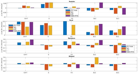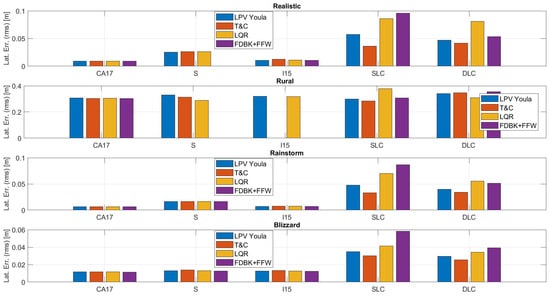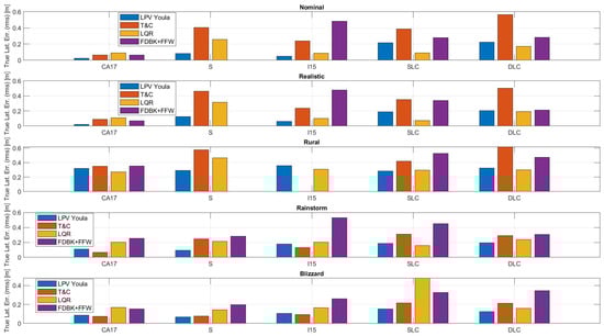 The maximum absolute true lateral error of each controller is not shown because the trends between controllers, maneuvers, and ODDs are the same. Furthermore, Figure 11 also presents information related to the maximum absolute performance of each controller. So, its inclusion does not add any additional information to the reader.