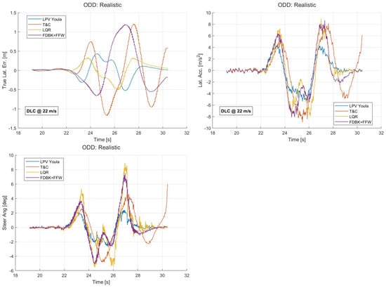 The results presented in this work build upon and greatly extend those of [,]. The extension is so great that several arguments can be proposed as a result of the observations detailed in Section 3. These arguments can be further supported by the work of [,]. When compared to these references, our work approaches controller comparison more systematically, rigorously, and practically. This is achieved mainly by introducing a set of ODDs. Model discrepancies are inherently captured because CarSim 2020 is used to simulate the vehicle dynamics while a dynamic bicycle car model is used to design the controllers. Sensor noises are included by appropriate simulation of sensors and fusion algorithms. Furthermore, a larger variety of maneuvers are used to evaluate each controller. Finally, the controllers studied in this work are wholly different from the ones studied in [,] (except for the Linear Quadratic Regulator).
