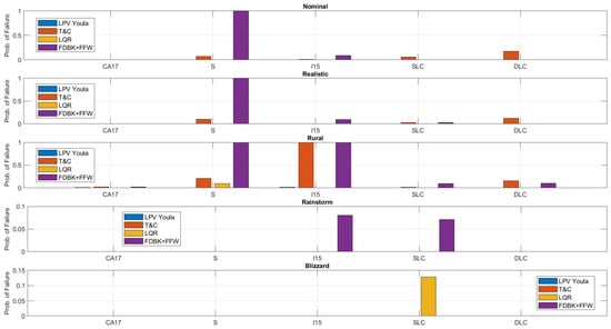 - Stochastic disturbances: One simulation was performed per controller, route, and ODD combination. The underlying assumption is that this simulation represents the worst case in that condition, which is a rather significant oversimplification. In the future, the simulator’s real-time factor can be improved and a Monte Carlo experiment can be used to evaluate the worst-case, average, and best-case performance of each controller. In this sense, it makes sense to redefine the probability of failure accordingly.