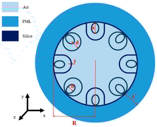 Figure 1 illustrates the cross-sectional structure of the designed HC-ARF. In the modeling of the fiber structure, a Perfectly Matched Layer (PML) was added as the outermost layer to calculate confinement loss and obtain the imaginary part of the mode effective refractive index [