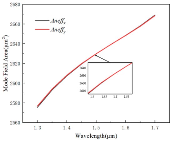 Figure 4 and the inset, it can be observed that the mode field areas for both x-polarized and y-polarized modes are nearly identical for the large mode field area, directly confirming the polarization-insensitive characteristic of this model. Even if there is a change in the polarization state direction, the LMA does not change significantly. Within the wavelength range of 1.3–1.7 µm, the mode field areas for both x-polarized and y-polarized modes show a monotonic increase, where the mode field area