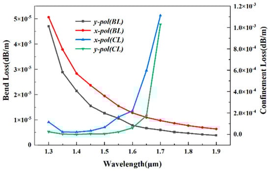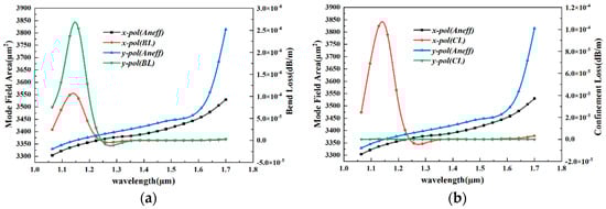 Figure 5. From the graph, it can be observed that the bending loss in the X direction is greater than in the Y direction, and compared to the CL, the BL continuously decreases with increasing wavelength. Therefore, at a wavelength of 1.55 µm, both BL and CL are relatively small, making them a prerequisite for efficient high-power fiber transmission and a key focus of our research. However, it is noted that when the wavelength reaches 1.65 µm, the losses sharply increase, which is one of the focal points for parameter optimization. To obtain more accurate bending losses, confinement losses, and large mode field areas, further optimization of the proposed HC-ARF LMA’s structural parameters is necessary.