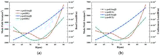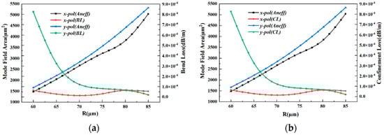 Figure 6b respectively illustrate the LMA, BL, and CL of x-pol and y-pol polarization states when the wavelength is 1.55 µm and the bending radius is 1 cm, with R ranging from 60 µm to 90 µm. From