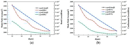 Figure 9b respectively depict the LMA, BL, and CL when the wavelength is 1.55 µm, and the bending radius is 1 cm, with d ranging from 13 µm to 17 µm in the x-pol and y-pol polarization states. Due to the decrease in wavelength and the corresponding change in the effective bending refractive index, the polarization sensitivity of the LMA for both x-pol and y-pol states is slightly stronger compared to the case when the wavelength is 1.55 µm. In both polarization states, the losses in the x-pol direction are consistently larger than those in the y-pol direction. There are significant losses at d = 13.5 µm and 15.5 µm, minimal losses at d = 16 µm, and high losses at d = 16 µm, but at this point, the losses in the y-pol direction reach a maximum. Therefore, when selecting d, it is important to avoid positions with significant losses to minimize energy loss in the fiber. To understand the impact of U-shaped tube parameters on the LMA, BL, and CL, the analysis focuses on the elliptical major axis within the U-shaped tube.