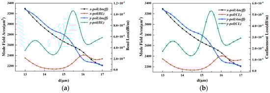 Figure 8a, it can be observed that as d increases from 13 µm to 17 µm, the Aneff decreases approximately linearly. This is because the increase in d reduces the cross-sectional area of the core, leading to a decrease in the mode field area. Additionally, with the increase in d, both BL and CL show an overall decreasing trend. The minimum values of BL and CL for both x-pol and y-pol polarization directions occur at d = 16.5 µm. The losses in the x-pol polarization direction are consistently larger than those in the y-pol polarization direction, which is related to the effective refractive index of the equivalent bent fiber. The images show that both x-pol and y-pol polarization states are insensitive, and the LMA is almost identical. This is directly related to the construction of the model. It is also observed that with the increase in d, the losses significantly decrease, but the mode field area also decreases. If the LMA is small, it directly affects the reduction of transmitted energy, which is unfavorable for high-power laser systems. Therefore, the selection of the nested tube diameter (d) for HC-ARF LMA should consider a trade-off between the LMA and losses, taking into account various factors.