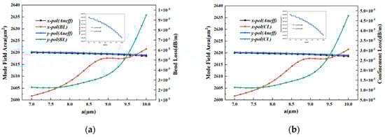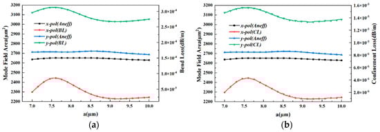 a increasing from 7 µm to 10 µm. Due to the decrease in wavelength and the corresponding change in the effective bending refractive index, the polarization sensitivity of x-pol and y-pol polarization states increases compared to the wavelength of 1.55 µm, but the overall trend remains the same. In both polarization states, the losses in the y-pol direction are consistently higher than those in the x-pol direction, with a significant loss observed at
