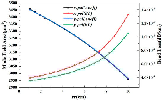 rr), the polarization insensitivity of LMA still exists. As shown in the figure, LMA decreases with the increase of the bending radius. This is because, with a larger bending radius, the propagation path of light inside the fiber becomes more curved, leading to an increased number of reflections within the fiber and consequently causing more leakage of light. This results in higher losses during the transmission of light in the fiber, affecting the transmission mode, and reducing the mode field area. It is evident that BL increases with the increase in the bending radius. The loss of hollow-core antiresonant fibers consists of three components: confinement loss, surface scattering loss, and bending (macro-bending and micro-bending) loss. Due to the limited overlap of the mode field between the cladding and the core, hollow-core antiresonant fibers exhibit relatively low surface scattering loss. Therefore, confinement loss and bending loss are the main sources of loss in hollow-core antiresonant fibers. This may seem contrary to common sense, but through consulting relevant literature, special cases have been identified. For example, as found in [