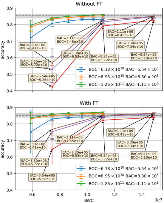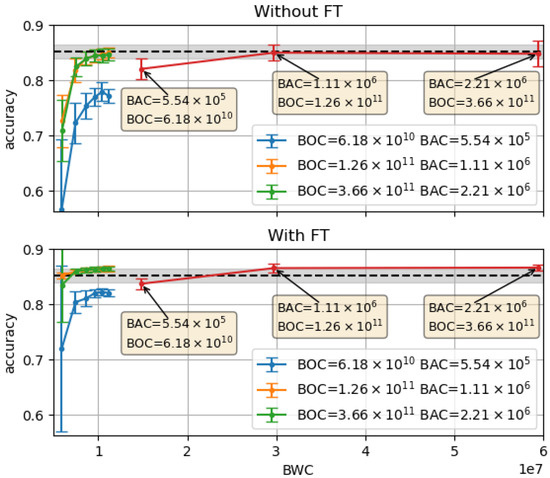 Figure 5 and Figure 6 showcase the results for the first and second cases, respectively. In both scenarios, applying NUUQ demonstrates the potential for a reduction in BWC without sacrificing accuracy, although achieving this requires a trade-off in BOC. This is evident in Figure 5, where a NUUQ case without sacrificing BOC (blue curve) does not yield superior accuracy, as applying NUUQ without sacrificing BOC is equivalent to UQ.
