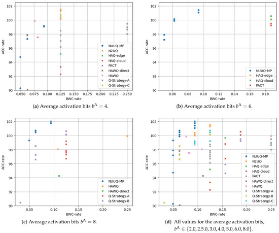 This figure provides a comparison of the accuracy and BWC rate between our work and others. Subfigures delineate various scenarios with average activation bits set to 4, 6, and 8 (see Subfigures a–c). Additionally, Subfigure (d) aggregates results from all previous scenarios alongside new ones. The name NUUQ-MP is the quantization proposed in this work, N2UQ in [18], HAQ-edge and HAQ-cloud in [12], PACT in [15], HAWQ-direct and HAWQ in [16], Q-Strategy-A in [17], Q-Strategy-B in [26] and Q-Strategy-C in [29].