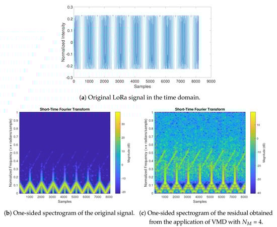 The value of was identified on the basis of the LoRa modulation and the settings of the data set. Because the study is focused on the residual, the number of modes is kept low within the following range: . A large number of modes may include the fingerprints, which are needed to classify the LoRa devices, while a relatively small number of modes would include the common elements of the signals, which we want to remove. Another hyper-parameter in the study is the window size, , used to generate the spectrogram. This value was chosen following the settings defined in [], where the data set was initially proposed. In [], a Gaussian window of was used, with an overlapping of 128. In this study, we also added the Gaussian window of with an overlapping of 64.