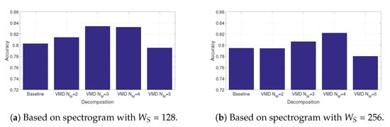 This assumption is validated by the following Figure 4a,b, respectively for spectrograms at and for different values of . Note that these figures are based on a partial application of the approach where the dimensional reduction with LBP is not implemented. Figure 4a,b show that the use of the residual from the VMD is able to outperform the direct application of the DL algorithm on the spectrogram of the original signal for both values and . The potential issue is to select the appropriate value of to achieve the maximum value of the accuracy. For , the optimal value of is 3 (even if the value of achieves a similarly high accuracy). For , the optimal value of is 4.