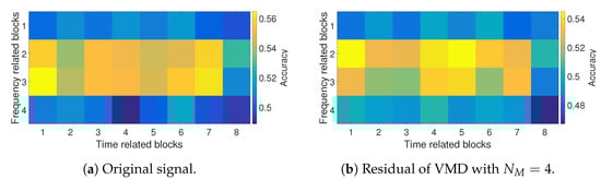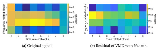 Similar results are obtained using , and they are shown in Figure 7a,b, respectively for the spectrogram of the original signal and the spectrogram of the residual using =4. The identification of promising areas is even more evident for than for . In particular, it is shown that the first areas (first along the time dimension) in Figure 7b have significantly higher accuracy than the other areas. This aspect may point to a more effective selection of the areas for . This assumption will be demonstrated in the subsequent results of this section. It is noted that the accuracy shown in the previous four Figure 6a,b and Figure 7a,b is low in absolute terms (highest values around 55% accuracy), but it is not important in the overall context of the approach because the accuracy is only used to select the most promising areas for further processing by the CNN.