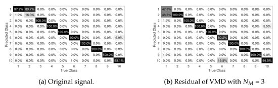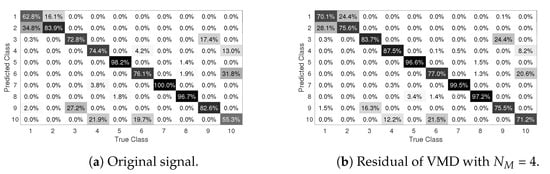 Figure 9a,b show, respectively, the confusion matrices for the spectrogram calculated with and applied to the original signal and the residual after the application of VMD.