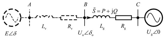 In order to ensure a suitable voltage-following capability for output voltage control, the bandwidth of the voltage–current dual-loop closure is set to be much larger than that of the external power control loop. As a result, the VSG-controlled GFM can be simplified as a controllable voltage source [27]. After introducing the virtual impedance control, the equivalent circuit diagram of its access to the AC grid is shown in Figure 2. Where E is the virtual internal potential amplitude of the VSG; δ is the phase difference between the virtual internal potential of the VSG and the grid voltage, which is the power angle; Uo and δo are the voltage amplitude at the output of the GFM and the phase difference between the GFM output and the grid voltage, respectively, after virtual impedance compensation is performed; and , P, and Q are the actual complex power, active power, and reactive power output from the virtual synchronous machine, respectively.