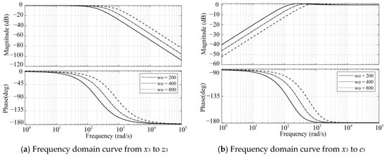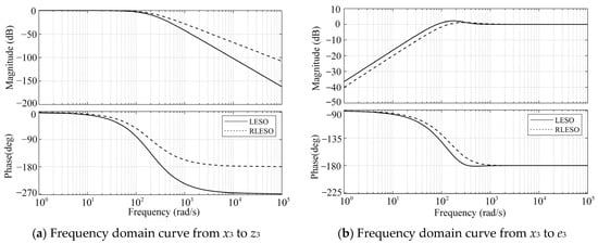 In order to analyze the performance of the ESO for disturbance estimation, two transfer functions from the actual total disturbance x3 to the ESO observed total disturbance z3 are established, as well as the transfer function from the actual total disturbance x3 to the total disturbance estimation error e3 = z3 − x3. Based on the derived transfer functions, the ESO can be analyzed from the frequency domain perspective.