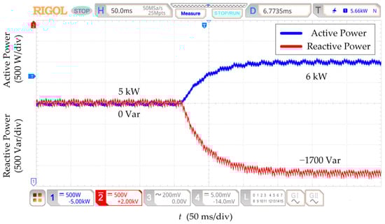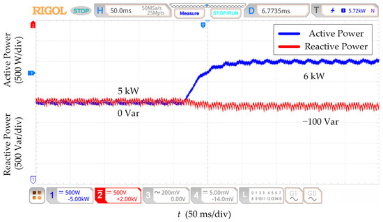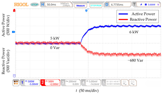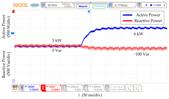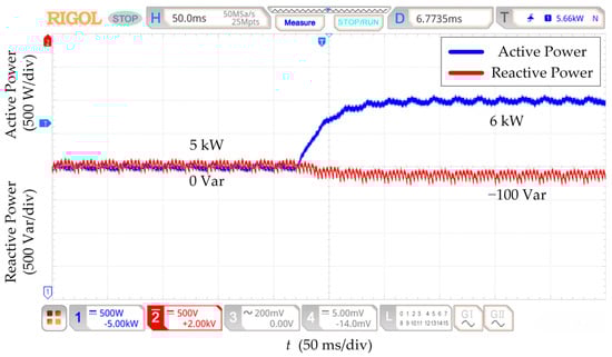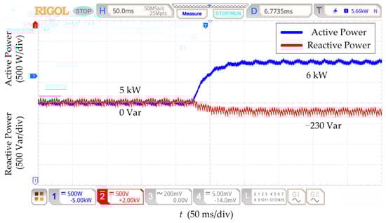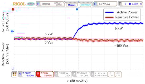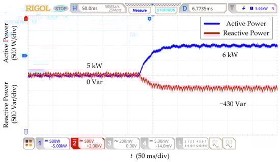 Under the initial state, the active power is 5 kW, and the reactive power is 0 Var. The parameters of the power decoupling strategy based on RESO are designed at nominal line impedance. Figure 12, Figure 13, Figure 14 and Figure 15 show that the reactive power changes by 100 Var for all four kinds of line impedance parameter perturbation conditions when the active power setpoint is increased from 5 kW to 6 kW. The RESO-based power decoupling strategy has better decoupling capability and more robust decoupling when the line impedance has different sizes of parameter perturbation.