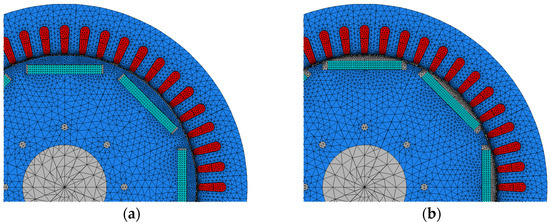 Two-dimensional FEM electromagnetic model—geometry and mesh of two variants of generators: (a) H-SIPM-01, (b) H = SM-07, and (c) circuit model of the bridge.