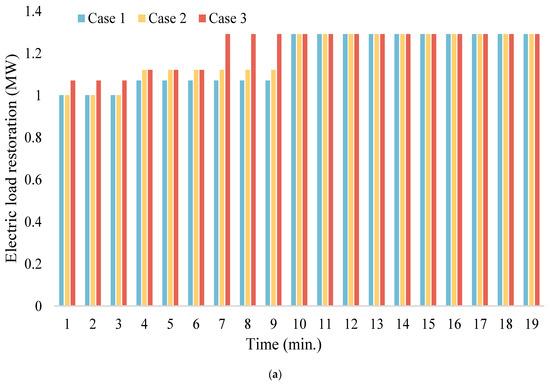 As shown in Figure 4, as the application of energy storage and grid reconfiguration strategies is implemented, there is a gradual increase in the amount of load recovery observed. The needed time for restoration and fault clearance in Cases 2 and 3 are 10 min and 7 min. These technologies enhance the system’s capacity to rapidly adapt and restore power and heat loads following disruptions, thereby ensuring a more resilient and efficient energy supply. The progressive deployment of storage and restructuring measures effectively mitigates the impact of outages, leading to improved stability and reduced restoration time in energy networks.