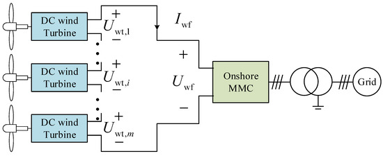 The topology structure of the existing series-connected system is depicted in Figure 1. In a series-connected DC wind farm, m wind turbine units with DC output voltages are directly connected in series to achieve voltage elevation. The electrical energy generated by the wind farm is collected in series and transmitted to the shore via underwater DC cables in the form of direct current. Finally, onshore converter stations perform DC-AC conversion, invert the electrical energy, and integrate it into the grid.