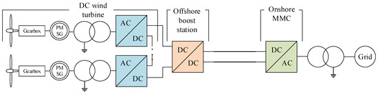 Based on the different methods of energy collection on wind farms, offshore wind power full-DC systems can be classified into parallel-connected systems and series-connected systems [6]. Typically, the output voltage level of DC wind turbine units is relatively low. After parallel collection of electrical energy, the voltage needs to be elevated to the high-voltage DC level by offshore boosting stations and then transmitted to onshore inverter stations via DC sea cables [7]. The voltage level of DC collection is generally around 50 kV, and if a voltage level of 320 kV is adopted for high-voltage DC transmission, offshore boosting stations would require DC/DC converters with a turns ratio of over 6. If direct transmission is implemented after parallel collection [8], it necessitates the construction of wind turbine units capable of directly outputting high-voltage DC. Each wind turbine unit would be equipped with a high-gain DC/DC converter on the DC side. However, achieving high gains in DC/DC converters is challenging with current technological capabilities [9]. Therefore, parallel-connected systems are not suitable for remote offshore scenarios.
