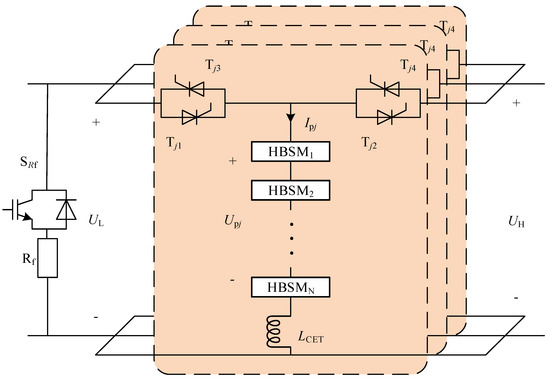 This topology consists of three phases (j = a, b, c), with each phase having an identical structure. Each phase comprises a capacitor energy storage bridge arm and four sets of switching valves (, , , ). The capacitor energy storage bridge arm is composed of several half-bridge submodules (HBSMs) and a bridge arm inductor connected in series [26,27]. Additionally, a DC energy dissipating device is installed on the low-voltage side, consisting of switches, , and dissipative resistors, . Control of the switching valves allows for energy transfer between the two sides of the CET converter. The energy storage bridge arm serves as a carrier for energy transfer, and by controlling the conductivity of the HBSMs, connectivity between different voltage levels on both sides of the CET converter can be achieved. The CET converter possesses the capability for fault isolation, and the DC energy dissipating device on the low-voltage side can consume the electrical energy output by the wind farm in non-steady-state conditions, such as short-circuits in the DC transmission lines, to maintain system stability.