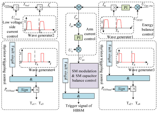 Due to the independent nature of the three phases of the CET converter, we will continue to illustrate the control strategy using its ‘a’ phase as an example. The control block diagram of the CET converter is depicted in Figure 8, encompassing low-side current control, energy balance control, bridge arm current control, and thyristor triggering control.