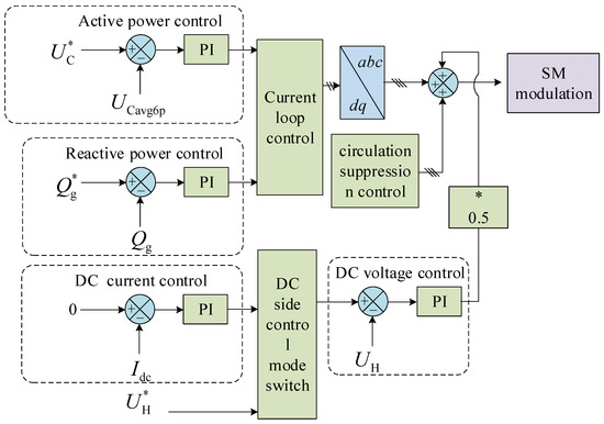 The control diagram of the onshore converter station MMC is illustrated in Figure 10, incorporating not only dual-loop control but also an independent DC control. Here, represents the average of the capacitor voltages of the six MMC bridge arms, while denotes the voltage command on the DC side of the converter station. The active outer loop controller is responsible for submodule capacitor voltage control, whereas the reactive outer loop controller remains unchanged from traditional strategies. During normal operation, the reference value for DC voltage control, , can be directly assigned. However, in the event of a short-circuit fault on the DC side, the DC control mode switches to DC current control, facilitating fault ride-through without tripping.