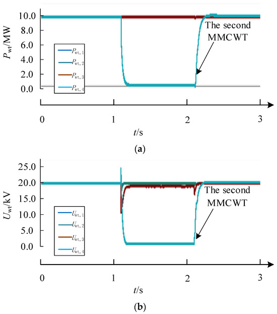 The simulation waveforms depicted in Figure 15 indicate that the system remains stable both when an MMCWT exits operation due to an internal fault and when a faulty MMCWT is reintroduced into operation. The removal and reintegration of the faulty MMCWT do not affect the operational status of the remaining MMCWT units. Furthermore, the power generated by the wind farm continues to be fully transmitted throughout the process.