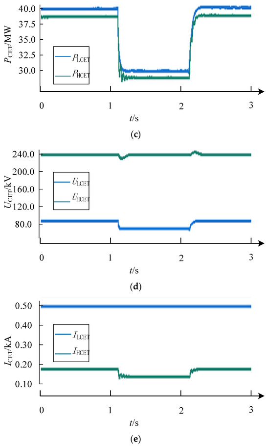 Figure 16 depicts the simulation results for the HVDC transmission line fault. From Figure 16a, it is observed that following the occurrence of a short-circuit fault in the DC transmission line at t = 1.1 s, both the power output from the MMC high-side and the power received by the onshore MMC drop to zero. Figure 16b illustrates that as the MMC switches to zero DC current control and the power devices of the CET converter are locked out, the DC side voltage decreases to zero. Moreover, Figure 16c shows that following the switch to zero DC current control at the onshore converter, the fault current entering the onshore MMC is rapidly suppressed, with the fault current decaying to zero within approximately 0.19 s, while the CET converter, through the locking out of power devices, causes the DC current to decay to zero. After fault clearance, the system resumes operation at rated conditions at t = 2.1 s. Notably, during the transient period of system recovery depicted in Figure 16b,c, the amplitude of the high-side current and voltage of the CET converter rises significantly. This phenomenon arises from the absence of a stable DC voltage establishment at the moment of unlocking at the onshore converter, resulting in a large deviation between the reference and actual values of the bridge arm current control in the unlocking instant. Figure 16d,e indicate that during the period of DC short-circuit fault, there are no significant deviations in the submodule capacitor voltages of both the CET converter and the onshore MMC.