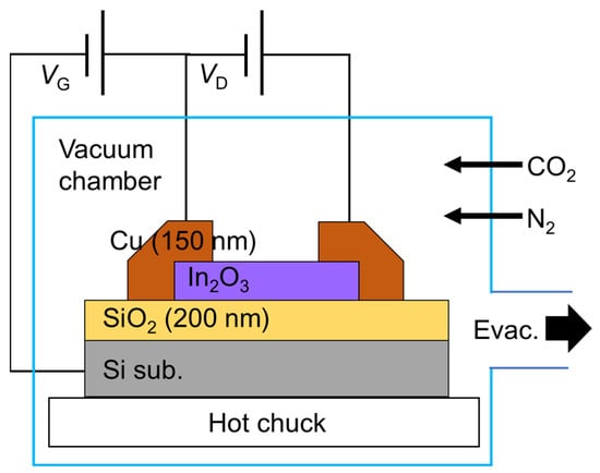 The fabricated TFT sensor was characterized in a vacuum probe station under an inert N2 atmosphere, which was then replaced with a CO2 atmosphere. The sensor was heated at 150 °C during measurement using perfluoropolyether heat-transfer fluid (Galden HT-200, Solvay Specialty Polymers, Bollate, Italy), and all environments were at atmospheric pressure during the characterization of the gas sensitivity. The current–voltage (I–V) characteristics of the fabricated TFTs were measured using a semiconductor parameter analyzer (Agilent 4156A, Santa Clara, CA, USA). A schematic cross-sectional diagram of the TFT and setup are shown in Figure 1.