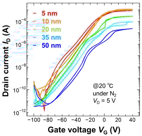 3.1. Channel Thickness-Dependent Transfer Characteristics at Room Temperature