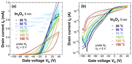 Temperature-dependent transfer characteristics of the 5 nm-thick In2O3 TFT: (a) linear and (b) semi-logarithmic plots. Measurements were performed under a N2 atmosphere.