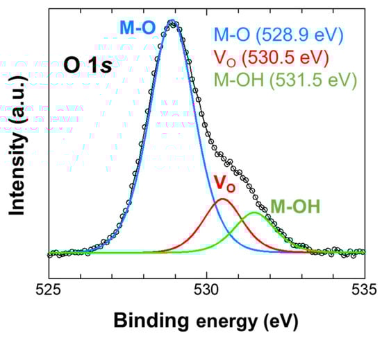 Figure 4 shows the XPS spectrum of the O 1s core level in the In2O3 thin film (t = 100 nm). The background due to inelastically scattered electrons was subtracted using the Shirley method. Generally, the O 1s spectrum of In2O3 can be deconvoluted into three peaks at 529.5, 530.6, and 531.8 eV, which are assigned to the In-O bonds on metal oxides (M-O), an oxygen-deficient region (related to the VO), and chemisorbed OH− species on the surface (M-OH), respectively [41]. The estimated peak area ratio for M-O, VO and M-OH is 74.12%, 14.63%, and 11.25%, respectively. However, a slight downshift of ~0.5 eV for the M-O component was observed in our In2O3. This shift is possibly caused by electron transfer [42], resulting in decreased carrier density compared to the standard In2O3. As we mentioned above, our oxide films may incorporate Ar+ impurities, and they cause a decrease in carrier concentration. The XPS result therefore indicates ion impurities incorporated during sputtering capture of electrons in the film. In an In2O3 semiconductor, oxygen vacancies (VO) are easily created [43,44] and form both shallow donor and deep trap levels [38]. Thermally activated electrons can transition from deep-level trap sites to the conduction band [45]. Therefore, the deterioration in electrical properties with an increase in temperature is caused by the activation of VO-derived electrons, which increases the carrier density.