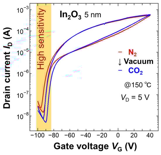 Transfer characteristics of the 5 nm-thick In2O3 TFT under N2 and CO2.