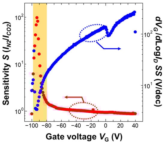 Because the fabricated In2O3 TFT exhibited on/off behavior even when it was heated to 150 °C, we measured the transfer characteristics under different N2 and CO2 atmospheres, as shown in Figure 5. A decrease in the off-current was confirmed under a CO2 atmosphere, indicating CO2 detection. Because the decrease in the current exhibited a gate-voltage dependence, we plotted the current reduction ratio as a function of the gate voltage. Figure 6 shows the relationships between CO2 sensitivity and gate voltage and between the SS value under a N2 atmosphere and gate voltage. The CO2 sensitivity was estimated from the ratio of ID under N2 (IN2) and CO2 (ICO2) atmospheres. The highest CO2 sensitivity was obtained in the subthreshold region of the small SS value. Although the operating temperature of the TFT-type CO2 sensor we fabricated still needs thermal activation, lowering the temperature should be considered for future application. Singh and Zou proposed that functionalization of the In2O3 surface with metal nanoparticles is effective in enhancing gas sensitivity, achieving room temperature sensing [46,47]. Thus, functionalization will be an efficient direction for further reducing energy consumption for In2O3 TFT-based CO2 sensors.