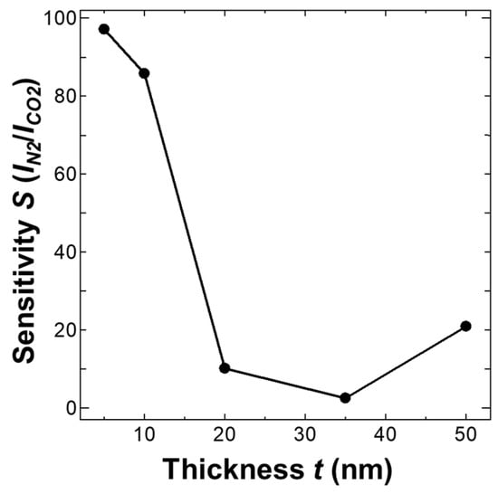 Figure 7 shows the CO2 sensitivity of the In2O3 TFT as a function of channel thickness. Each sensitivity was extracted from the maximum value of the VG-dependent plot (Figure 6 for the case of the 5 nm-thick TFT). The CO2 sensitivity increased as film thickness decreased; the maximum sensitivity was obtained at 5 nm. We believe that the formation of a depletion layer reaches the backchannel surface owing to the thinning of the film even at 150 °C [48]. As we discussed, Vth was shifted under heating, which is more remarkable in thicker films, with less on/off behavior. However, the 5 nm-thick TFT retained its switching behavior, suggesting that the channel depletes even at 150 °C. A slight improvement in sensitivity in the 50 nm-thick TFT might be due to increased surface roughness. It is well known that crystallinity in In2O3 can be converted to polycrystalline from smooth-surfaced amorphous layers of with increasing thickness [49].