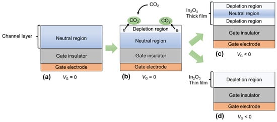 The depletion layer formed on the surface affects the subthreshold region of the TFT. When a negative gate voltage was applied, a depletion layer was formed at the In2O3–SiO2 interface. However, if the channel was a thick film, the distance from the surface to the In2O3–SiO2 interface was long; therefore, a neutral region remained in the middle part (Figure 8c). On the other hand, the distance decreased in the thin-channel case, and hence the overall channel was depleted (Figure 8d). In other words, in thick films, the effect of the surface depletion layer is small. However, in thin films, the surface depletion layer causes a transition to the subthreshold region at a smaller VG. This phenomenon directly improves the sensitivity of the gas sensor because, as mentioned above, for gas sensing in TFTs that utilize charge transfer with the adsorbed gas molecules, a shift in Vth correlates with a change in the carrier density in the depletion layer region [53]. Therefore, after CO2 adsorption, Vth shifted slightly in the positive direction (Figure 6) and CO2 sensitivity increased in the SS region, where a depletion layer was formed. In terms of the film thickness, the surface state became more sensitive as the film thickness decreased, and the highest CO2 sensitivity was obtained in the case of the thinnest-channel TFT.
