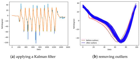 The raw data measured by the accelerometer were converted into analyzable roll data through preprocessing and data refinement such as outlier removal and filtering. Figure 4a shows the preprocessing of raw data with a Kalman filter, and Figure 4b shows the results after removing outliers. Figure 4b shows a graph of gait cycles that were extracted and continuously superimposed, with the red lines being the outlier gait cycles.