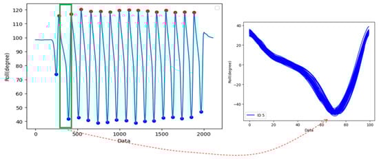 We split the roll data into sub-graphs for each gait cycle and then overlaid each sub-graph by aligning it with the beginning of the gait cycle. The right side of Figure 5 shows the superimposed graph for subject 5. The graph generated by overlaying gait cycles describes the gait characteristics of subject 5. By overlaying gait cycles, we can identify the statistical characteristics of the gait cycles.