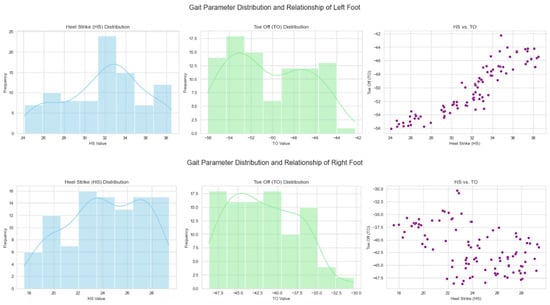 The visualizations shown in Figure 6 provide insights into the distributions of the HS and TO values and the relationships between them for both the left and right feet. The HS distribution indicates that both feet showed a range of HS values, and the distributions indicate variability in Heel Strike positions and intensities across different gait cycles. Similarly, the TO values for both feet display variability, reflecting differences in the Toe-Off phase of the gait cycle. The scatter plots in Figure 6 reveal the relationships between the HS and TO values for each foot, highlighting how these two parameters vary together across different gait cycles.